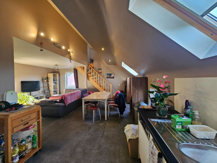 Cet appartement comprend un lumineux séjour (±23m²) avec une cuisine américaine super équipée (frigo, 4 taques, four), une belle chambre (±12 m²), une salle de douche et un WC séparé.