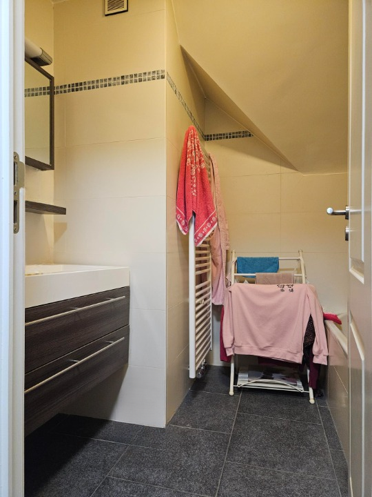 Une buanderie, une cave (± 9m²) ainsi qu’un emplacement de parking intérieure viennent compléter le tout.